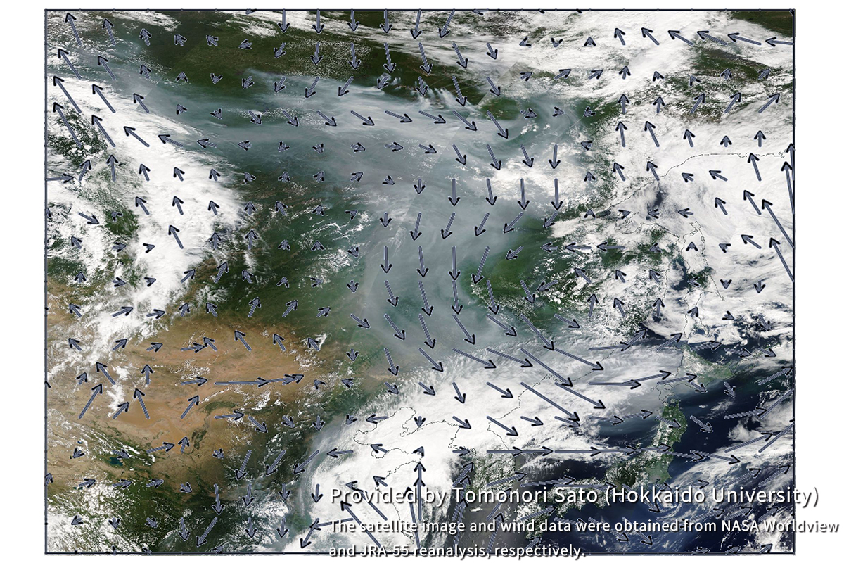 Long distance transport of forest fire smokeSmoke from forest fires in the boreal forest has been transported to northern Japan. The image illustrates a distinct atmospheric circulation pattern that facilitates the long-distant transport of air pollutants.
