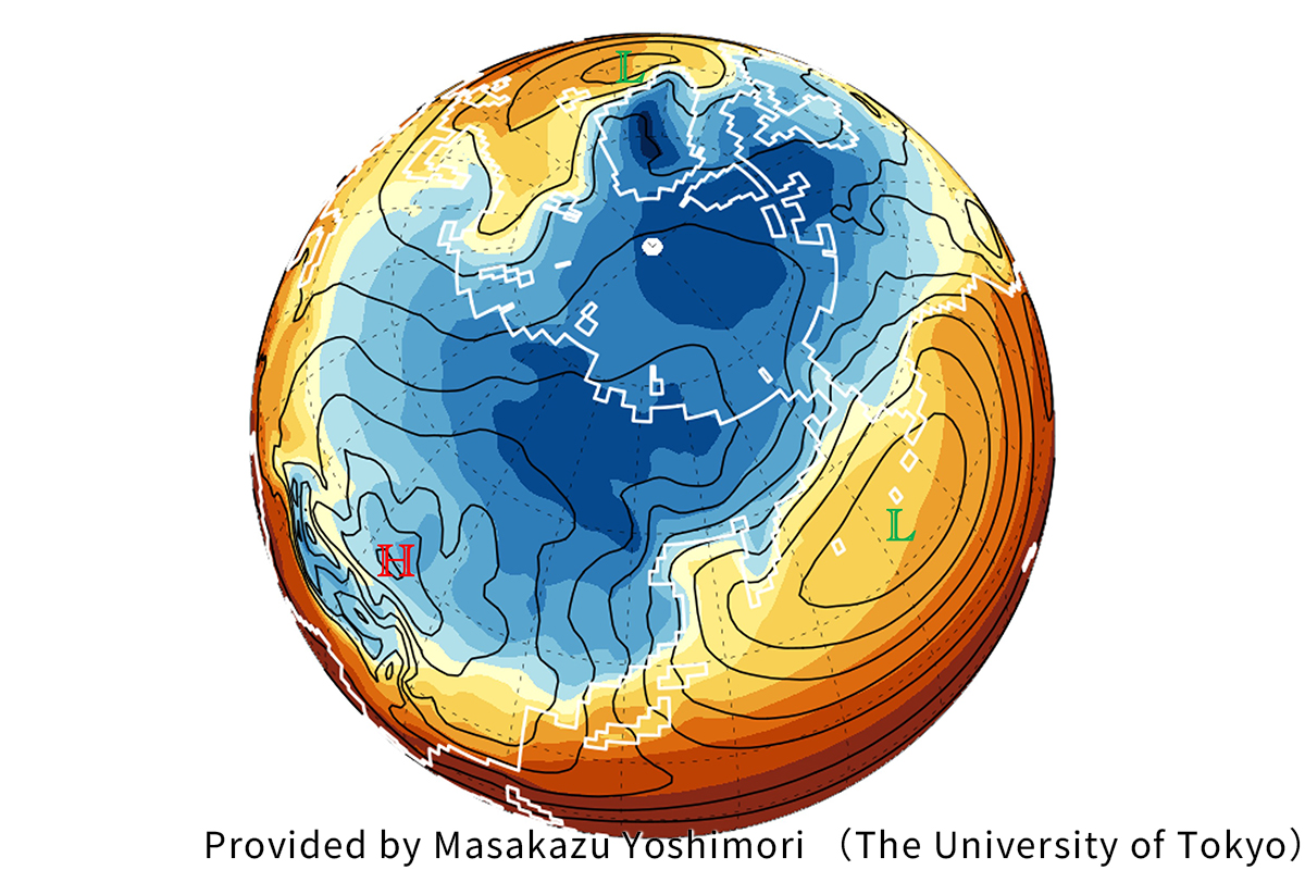 Model-simulated winter air temperatureThe figure presents surface air temperature and sea level pressure in January simulated by a climate model, implying that the cold air reaching Japan is originated from Siberia and the Arctic region.