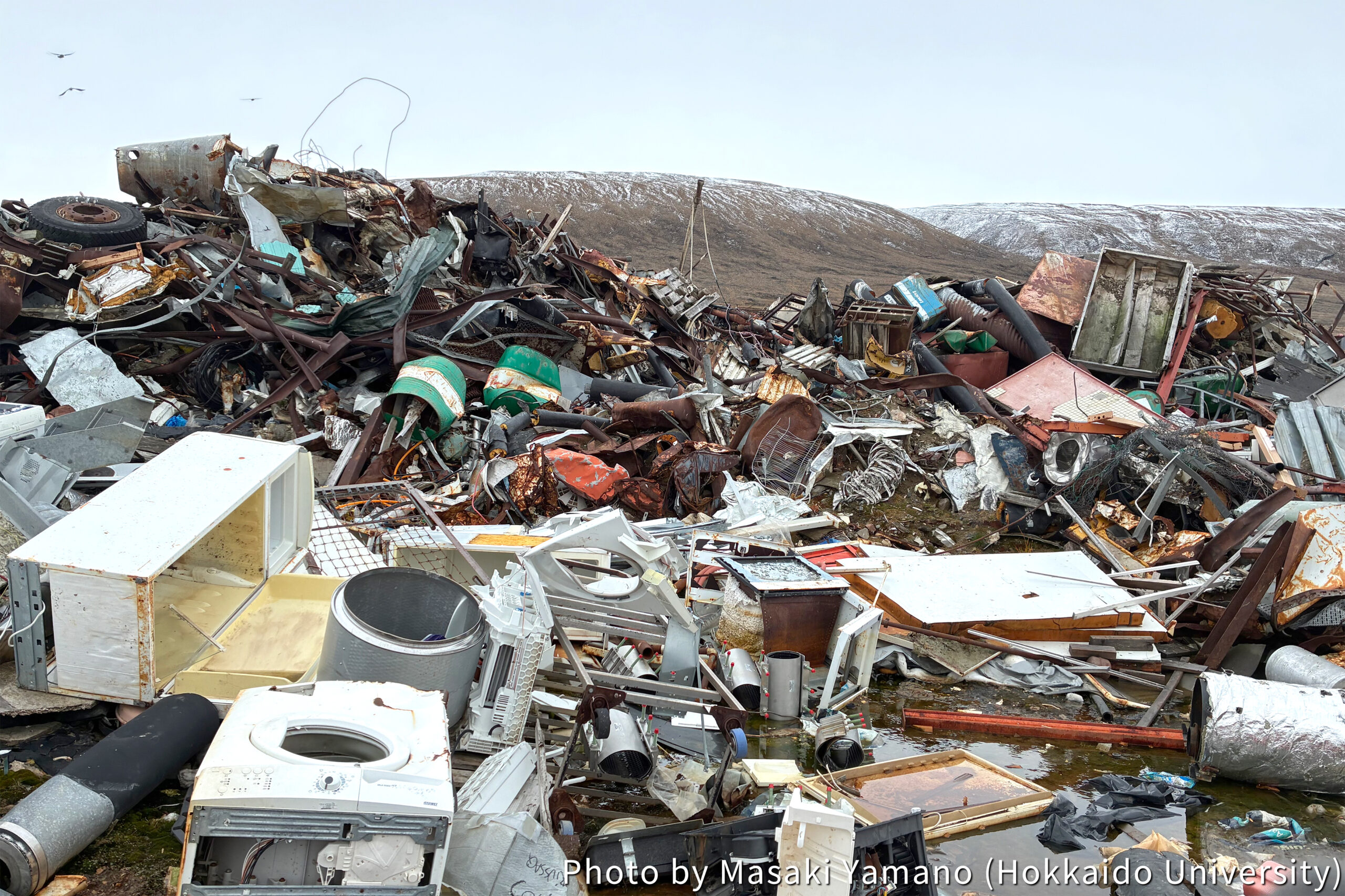 From to , I conducted blue mussel (Mytilus edulis) sampling, observations using various sensors, and questionnaire surveys in the villages of Qaanaaq and Siorapaluk in northwestern Greenland to assess the current state of environmental pollution surrounding blue mussels. Mussels are native to the Mediterranean Sea, but due to recent global changes in the marine environment, their habitat has shifted northward, reaching as far as northern Greenland. While blue mussels are sometimes used as local food in coastal communities, there are concerns about heavy metal contamination of blue mussels from coastal garbage dumpsites (Photo 1) and the resulting health hazards.
