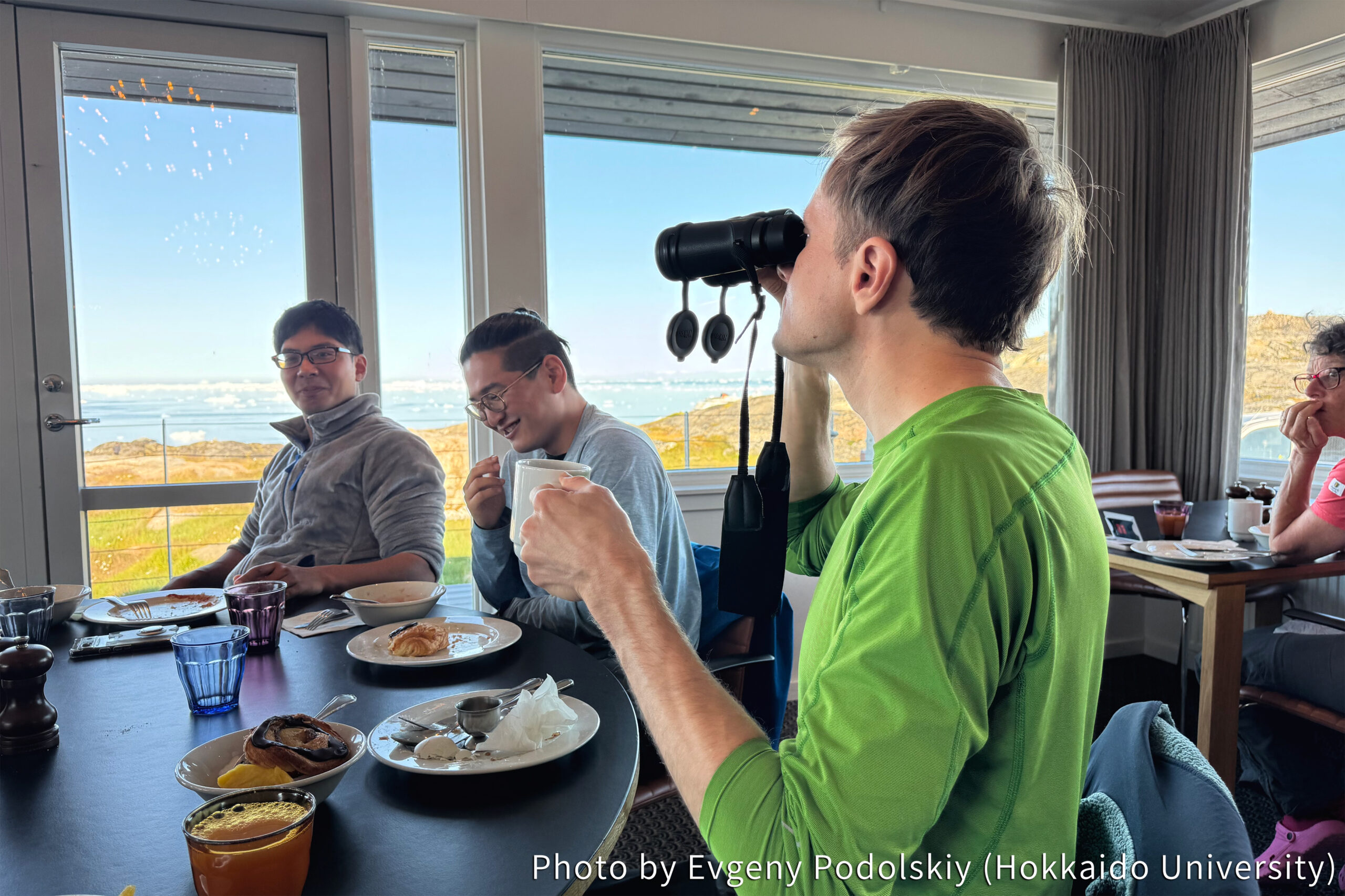 Meanwhile, Ilulissat is renowned for its stunning Ice Fjord, a UNESCO World Heritage Site where large baleen whales swim among massive icebergs. Wealthy tourists pay a lot to visit this incredible place, and we are taking advantage of this free opportunity to explore the fjord, enjoy good food, and test our equipment. For example, in the last 24 hours, we could try local seafood and conduct a whale survey from the restaurant over breakfast (just kidding;) – without some humor, Arctic research is a hopeless thing) (Photos 3,4).