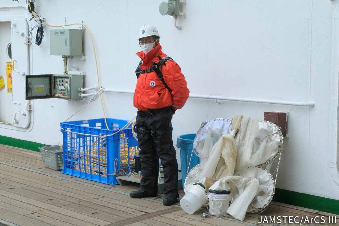船はベーリング海峡南部までやってきました。いよいよ海洋観測スタートです。バケツを使った表面海水の採取はそれなりの力作業となりますが、首席研究者も(たぶん)ノリノリで手伝っていました。