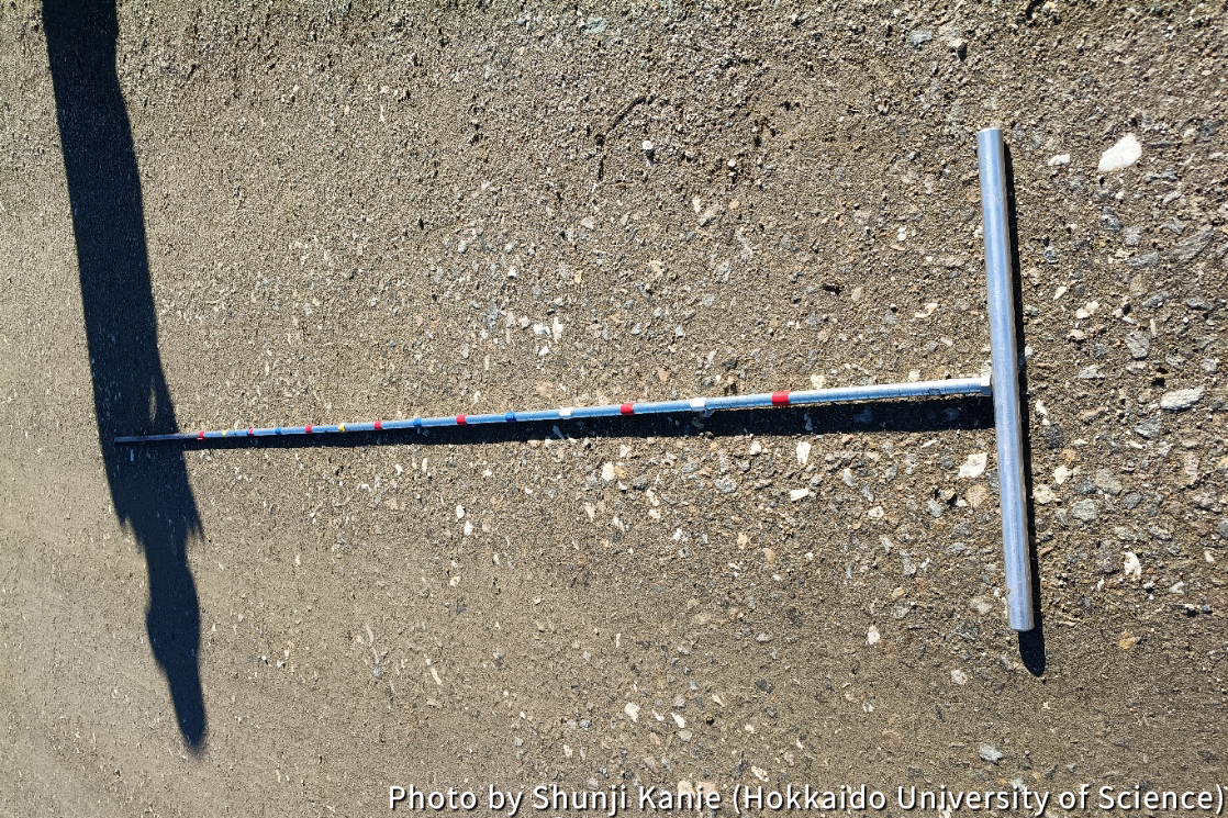 The standard method for measuring permafrost thaw depth is probing with a thaw probe (Photo 2). We push the probe, which is up to 2 meters long, into the ground until its tip hits the frozen layer, allowing us to measure the thaw depth. We are diligently measuring the thaw depth through dozens of repetitions of this laborious task, often struggling to keep our footing on the distinctively soft vegetative layer covering the permafrost terrain. We aim to use the observation and measurement results, as well as application of numerical models, for a comprehensive, multi-faceted assessment. This includes evaluating the vulnerability of the permafrost, such as determining where increased precipitation promotes thaw depth, and simultaneously assessing the role of vegetation layer recovery in preserving permafrost in areas affected by wildfires.