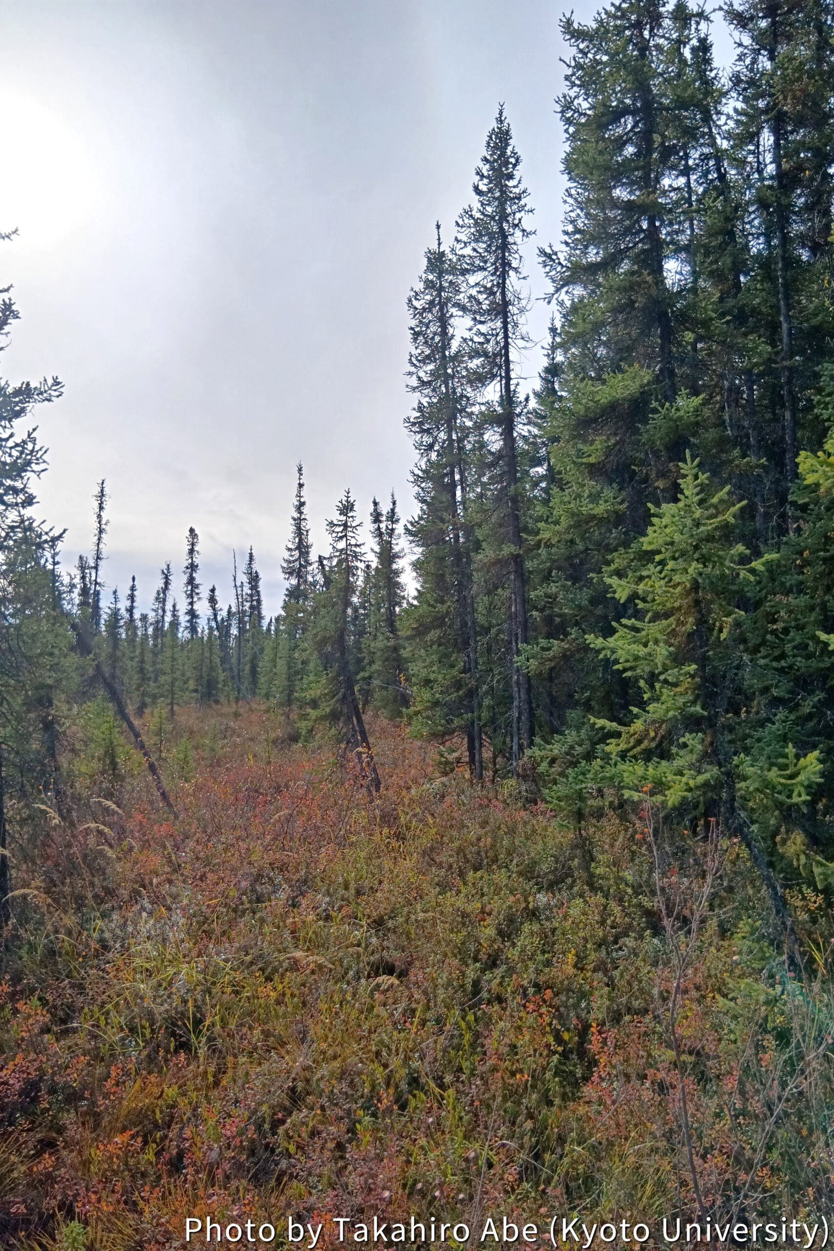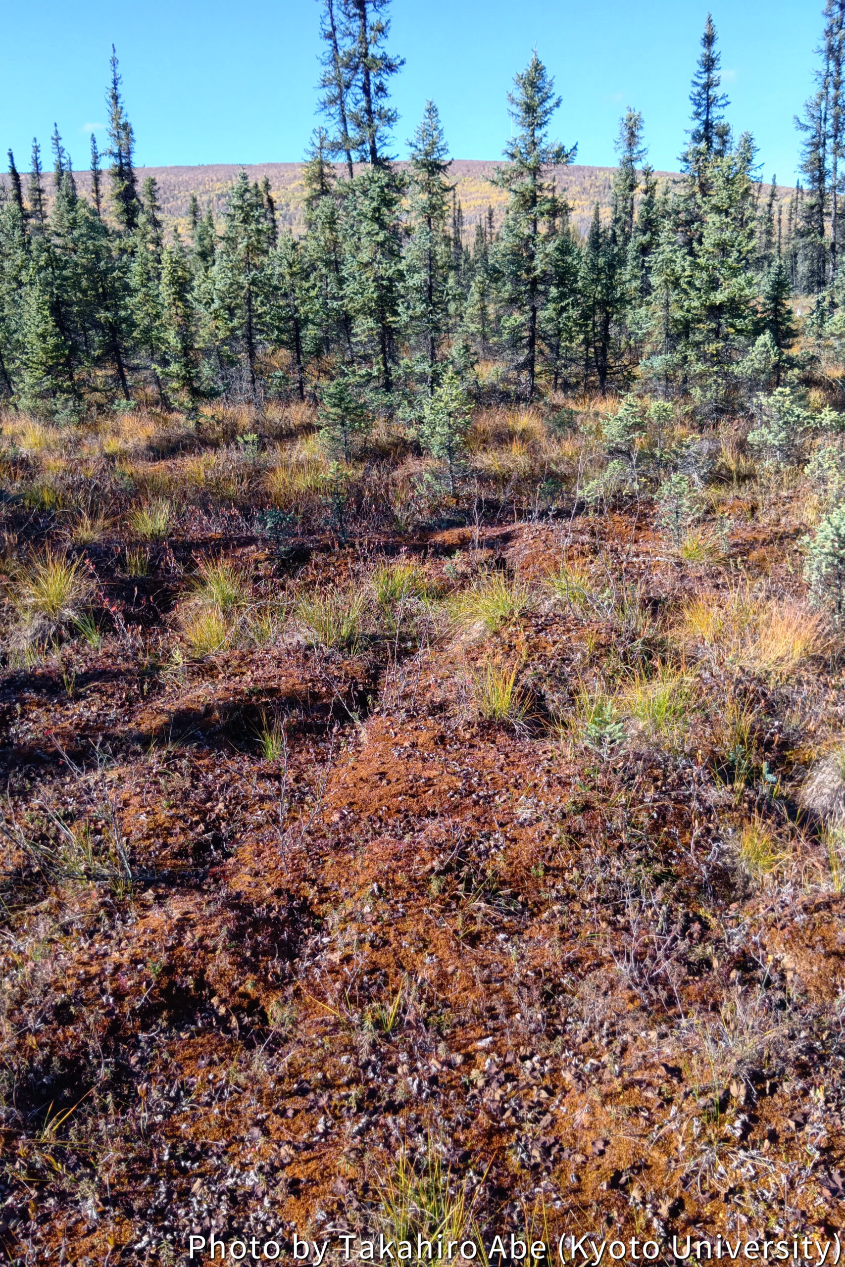 This is intended to aggregate broad environmental change data across the Arctic region. In this study, we conducted a field survey on the relationship between vegetation distribution and the frozen ground environment on permafrost. For instance, in areas that appear as distinctly bright green on satellite optical images, we found few tall trees, but instead, wet-loving herbaceous plants dominated, turning the area into a pond-like environment, with water submerging the ground up to knee height (Photo 3). Near the flux tower, sparse black spruce trees were present, with mosses and lichens visible in the gaps (Photo 4). This suggests that these differences may indicate variations in the micro-environment near the ground surface. Conversely, approaching the Chatanika River to the northwest, we observed a dense growth of large black spruce (Photo 5), a region thought to be mostly free of permafrost.