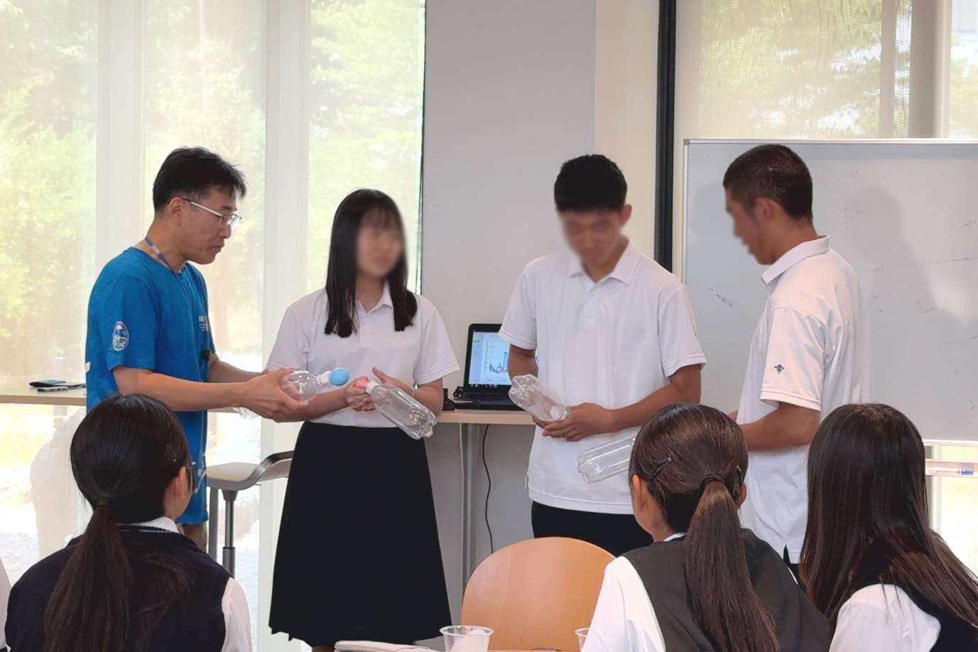 雲は気候の将来予測において重要な要素ですが、その変化予測は非常に困難です。このため、極域の雲について研究することの重要性が伝えられました。生徒たちは、ペットボトルを使った雲の生成実験や、実際の観測センサーを用いたエアロゾル(大気中を漂う微粒子)測定を通して、雲の模擬観測を体験しました。