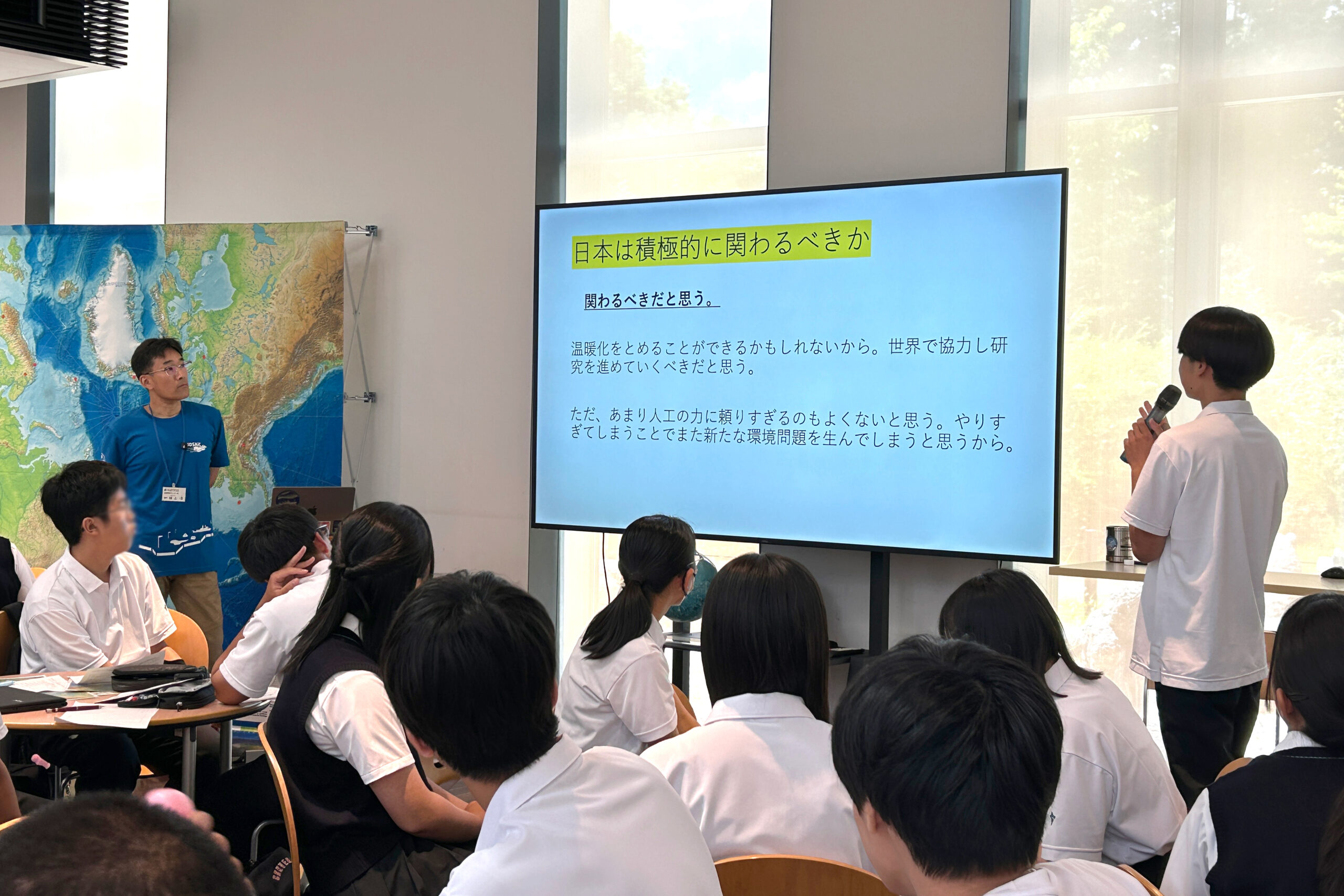 後半のグループワークでは、地球温暖化への適応策として注目される気候工学について、その是非や環境、人間、国際関係への影響、日本が積極的に研究を進めるべきかについて話し合いました。答えのない問題を考えるこのワークでは、各班がディスカッションを通じて意見をまとめ、全体発表では多様な考えを共有することができました。