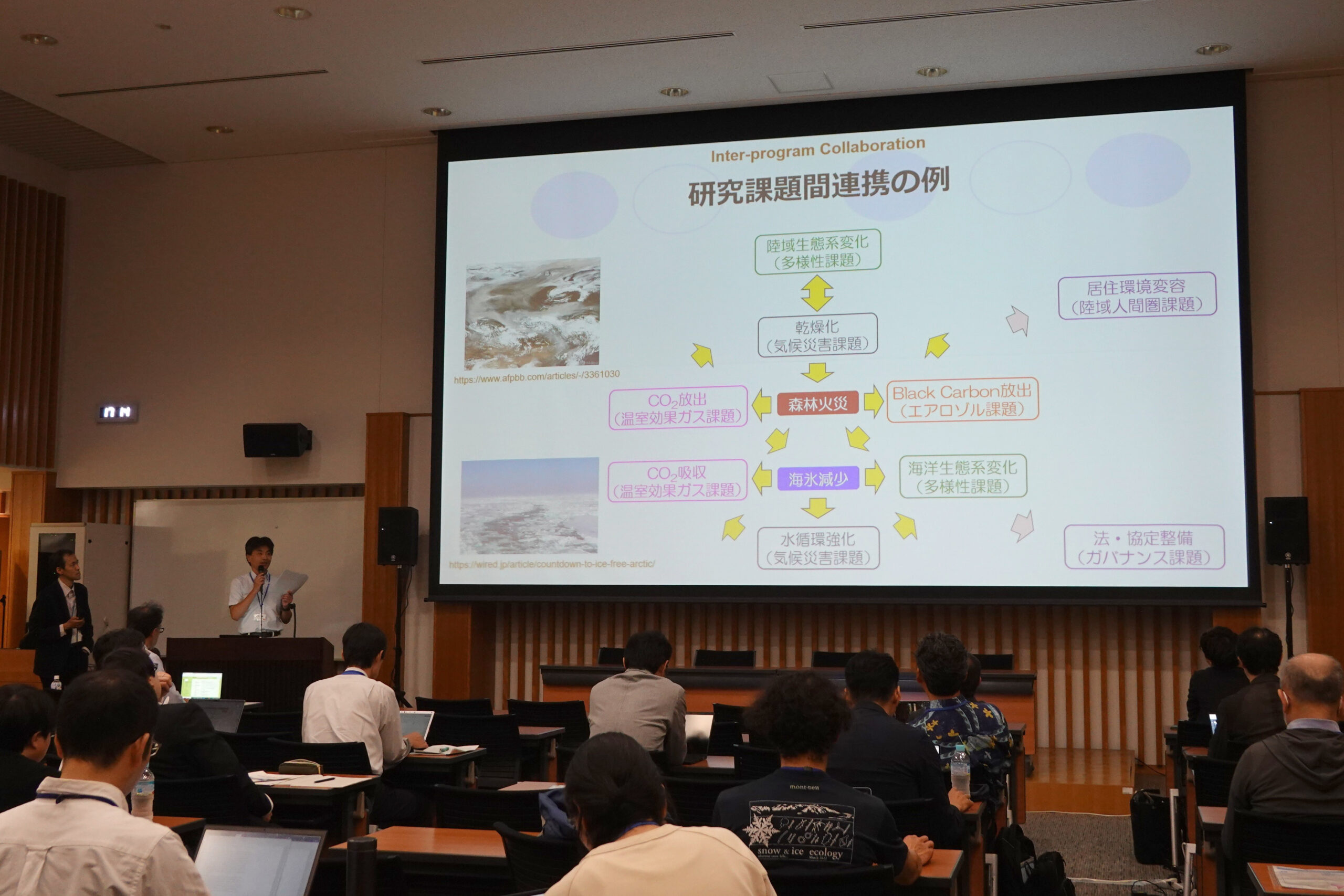 国立極地研究所の野木 義史所長、文部科学省、羽角 博康PDの挨拶から始まり、午前中には3つの戦略目標と7つの研究基盤の紹介が行われました。午後には新たに着任したArCS III特任助教と10つの研究課題の紹介が行われた後、質疑応答と総合討論が活発に行われました。