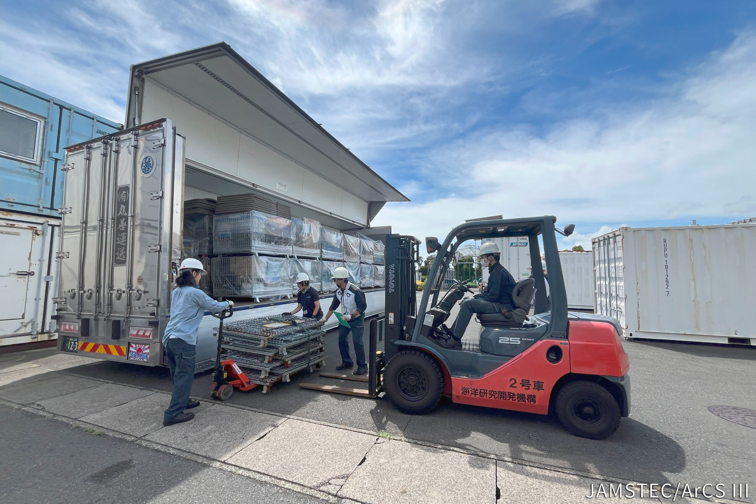 JAMSTECをはじめ、乗船者たちの荷物を積んだ大型トラックが次々と港に到着。
