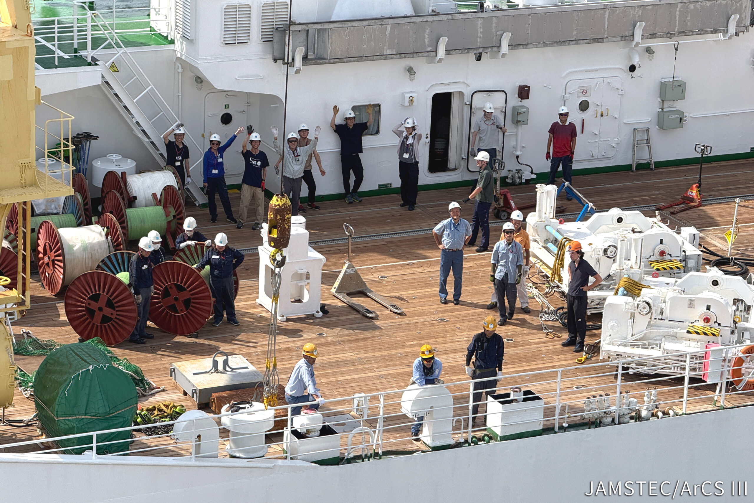 7月下旬には、青森県むつ市の関根浜港で「みらい」への観測機器などの積み込み(艤装・ぎそう)を行いました。