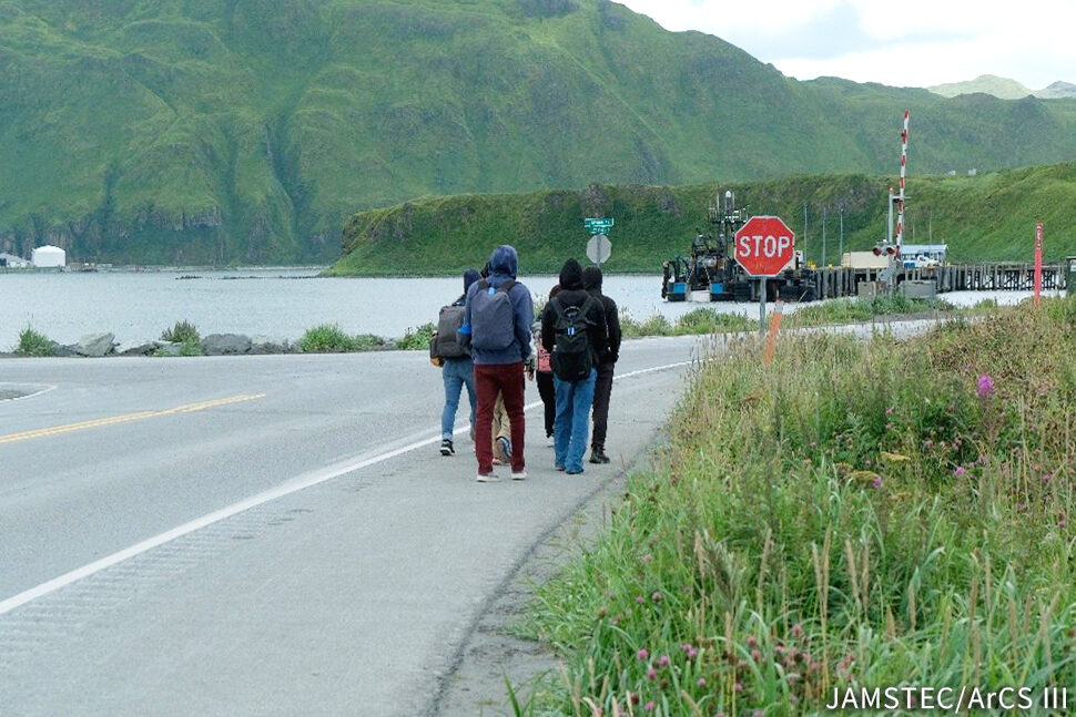 それを過ぎると飛行機は徐々に降下していきます。雲の下に抜け、ダッチハーバーの港に停泊している「みらい」を右下に見つつ、左手に切り立った山肌に沿うように飛行機は降下していき、最後は一気に右旋回してウラナスカ空港の滑走路に着陸しました。