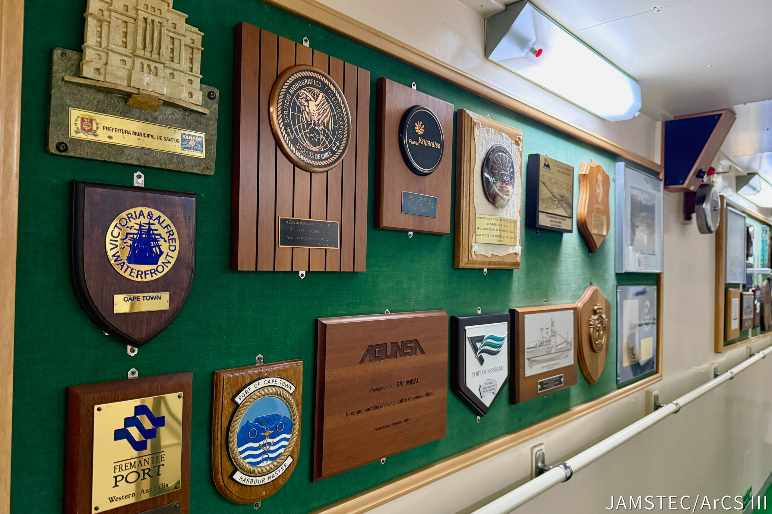 「みらい」は研究船としては非常に大きく航続距離も長いので、就航以来様々な港に寄港しています。大会議室や廊下には、現地で寄贈された各港の飾り板や美術品が展示されています。