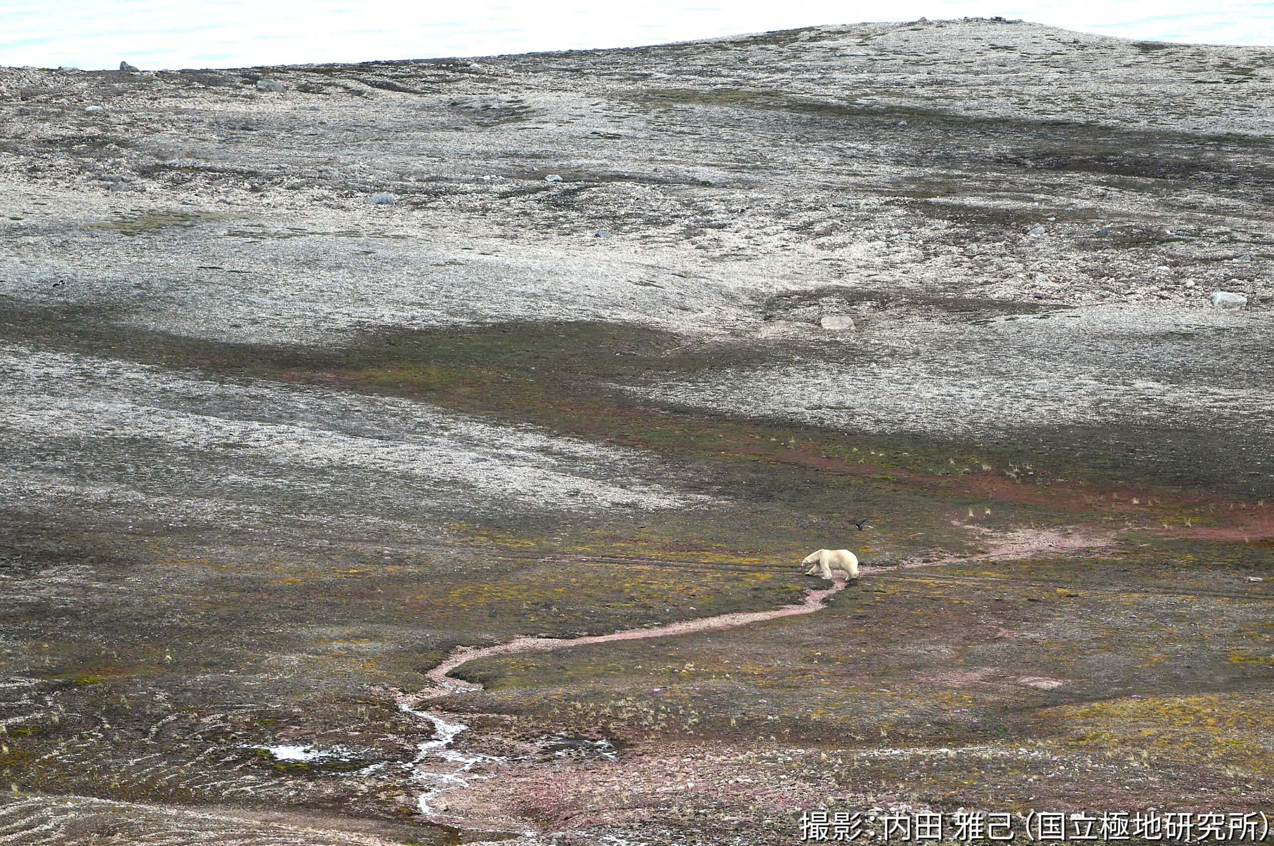 夏、ホッキョクグマの出没数は多く、調査中は常に注意が必要です。氷河周辺での野外活動中にも無線でクマ出没の連絡があり、ニーオルスン基地の近くでも目撃されています。また私が野外調査に同行した際に、崖の上から私たちの目的地方向へと悠々と歩いていくホッキョクグマを見つけました(写真9)!安全を確保するため、速やかに基地へと引き返しましたが、クマの危険性を肌で感じつつも野生の姿を見られた貴重な体験でした。